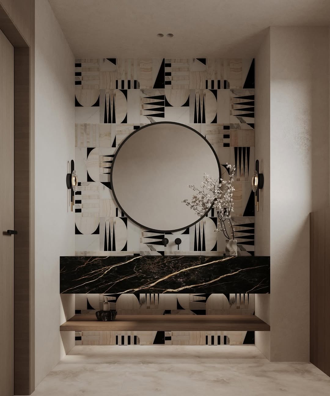 A bold black marble sink floats against an artistic backdrop of geometric tiles in cream and noir. The circular mirror adds softness, balancing the strong linear energy. Ambient backlighting and brushed-gold sconces enhance the boutique-hotel vibe.